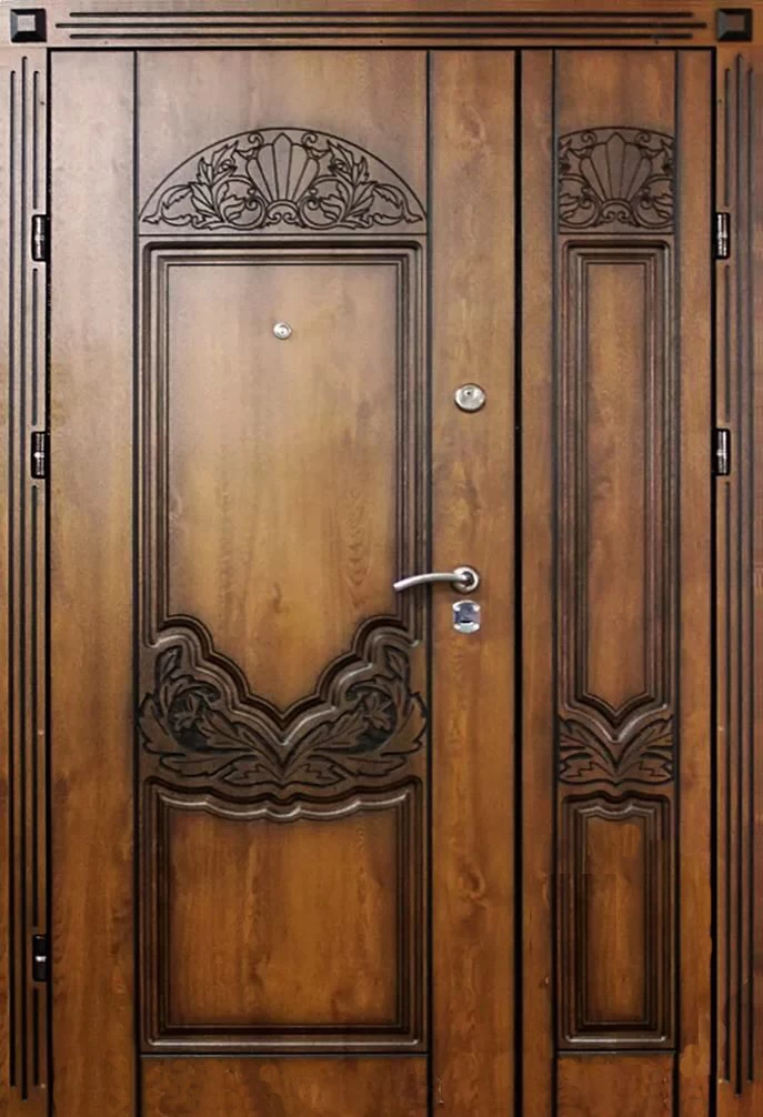 Поскольку в большинстве случаев устанавливаемые на входе в коттедж двустворчатые двери являются еще и предметом интерьера, украшающим здание, их дизайну предается особое значение. Эти двери, как правило, отделываются атмосферостойким МДФ, натуральным шпоном, массивом. Эффектно на таких дверях смотрится витражный узор, применение ковки, зеркальных элементов. Вариантов декора входной двустворчатой двери масса, тут все зависит от пожеланий заказчика.